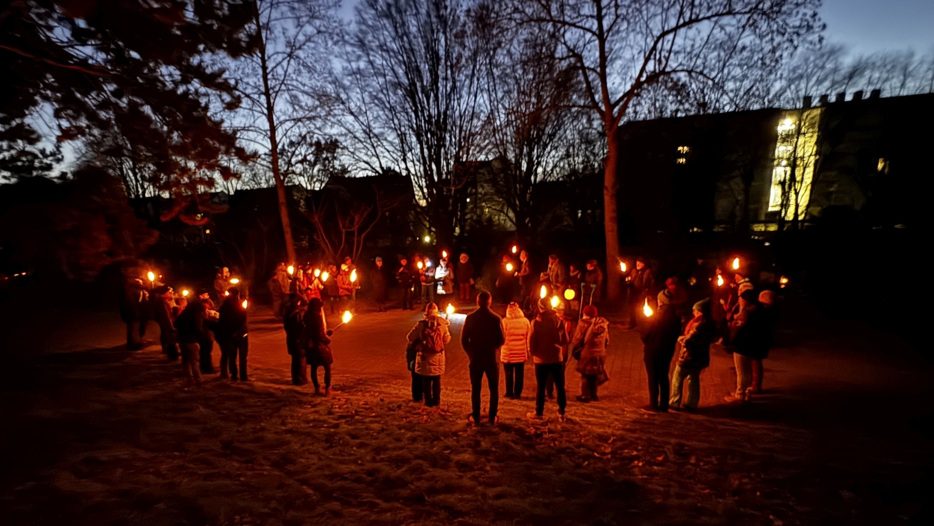 Nachdem der letzte Rundgang Ende 2024 mit über 40 Personen sehr gut besucht war, waren wir auf die Besucherzahl 2025 gespannt - und es waren wieder über 40 gekommen! Wir waren diesmal besser vorbereitet und hatten Fackeln, die den ganzen Rundgang brannten und ein portabler Lautsprecher erleichterte es akustisch alle besser zu erreichen. Einzig auf das Wetter hatten wir keinen Einfluss: im Verlauf des Rundgangs fiel das Thermometer in den Minusbereich.