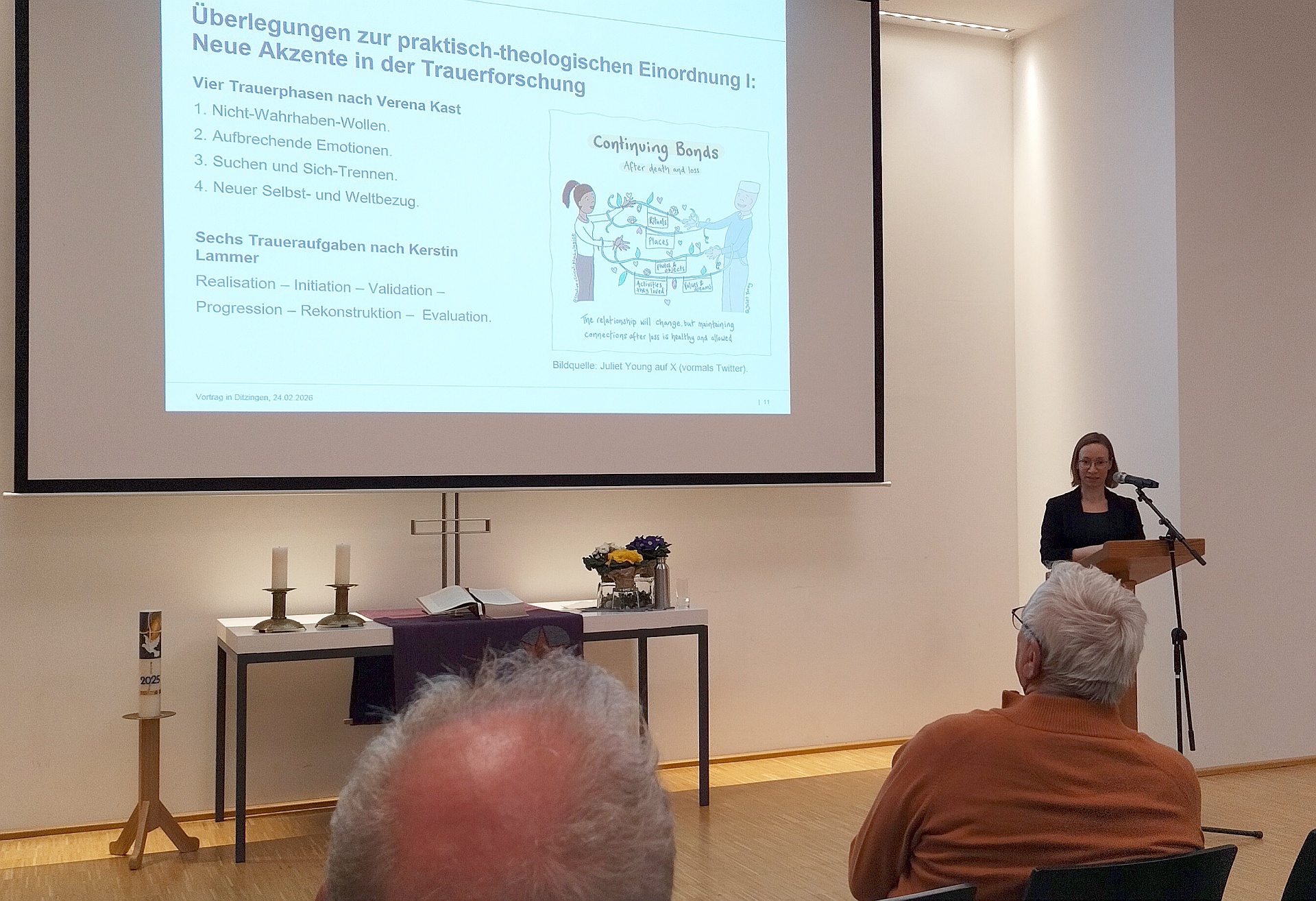 Am 24. März 2026 ging es in einem Vortrag von Frau Dr. des. Lea Stolz, Wissenschaftliche Mitarbeiterin am Lehrstuhl für Praktische Theologie der Universität, um die Bestattungskultur im Wandel und digitales Trauern.
